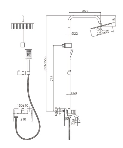 Душевая система со смесителем и тропическим душем встроенный в излив переключатель