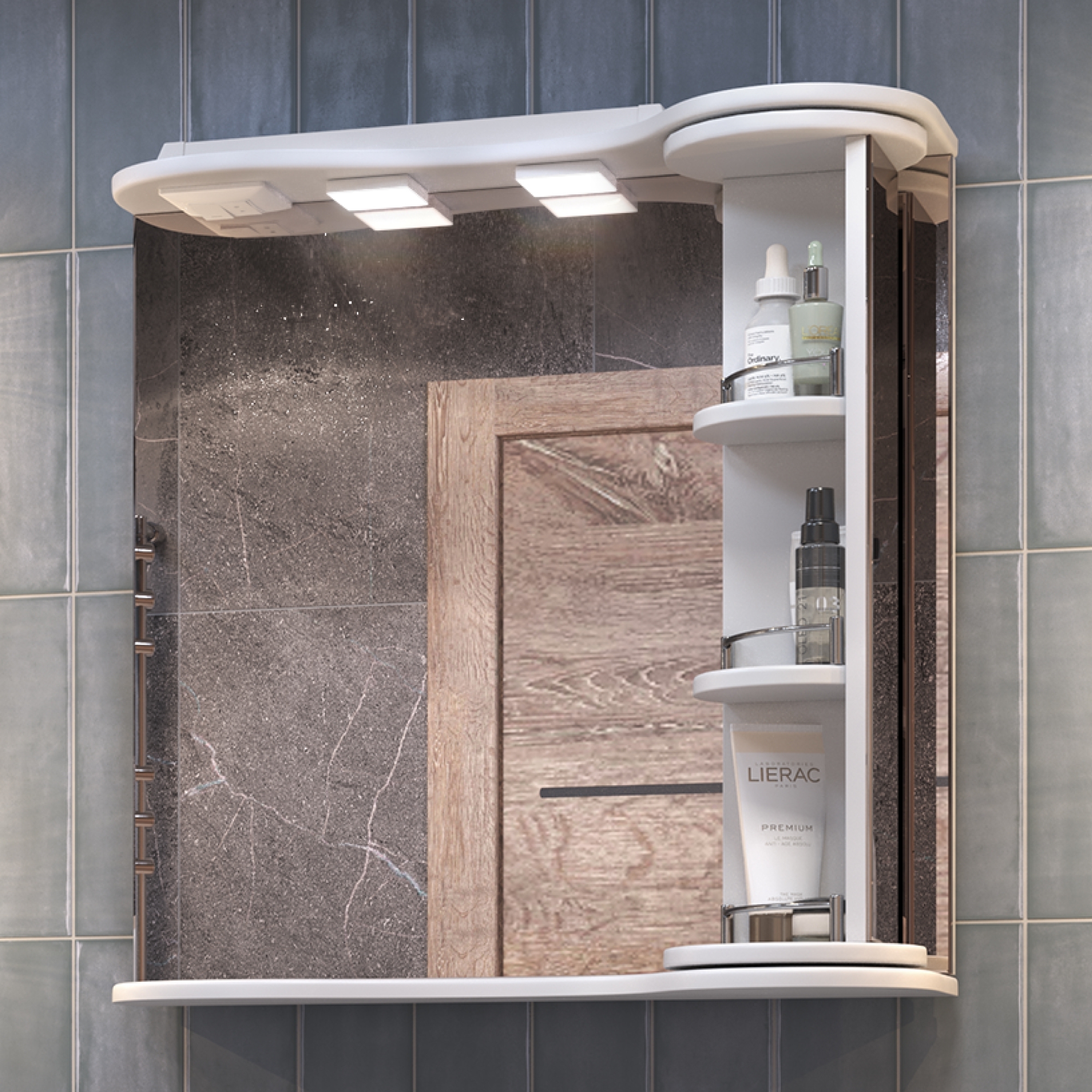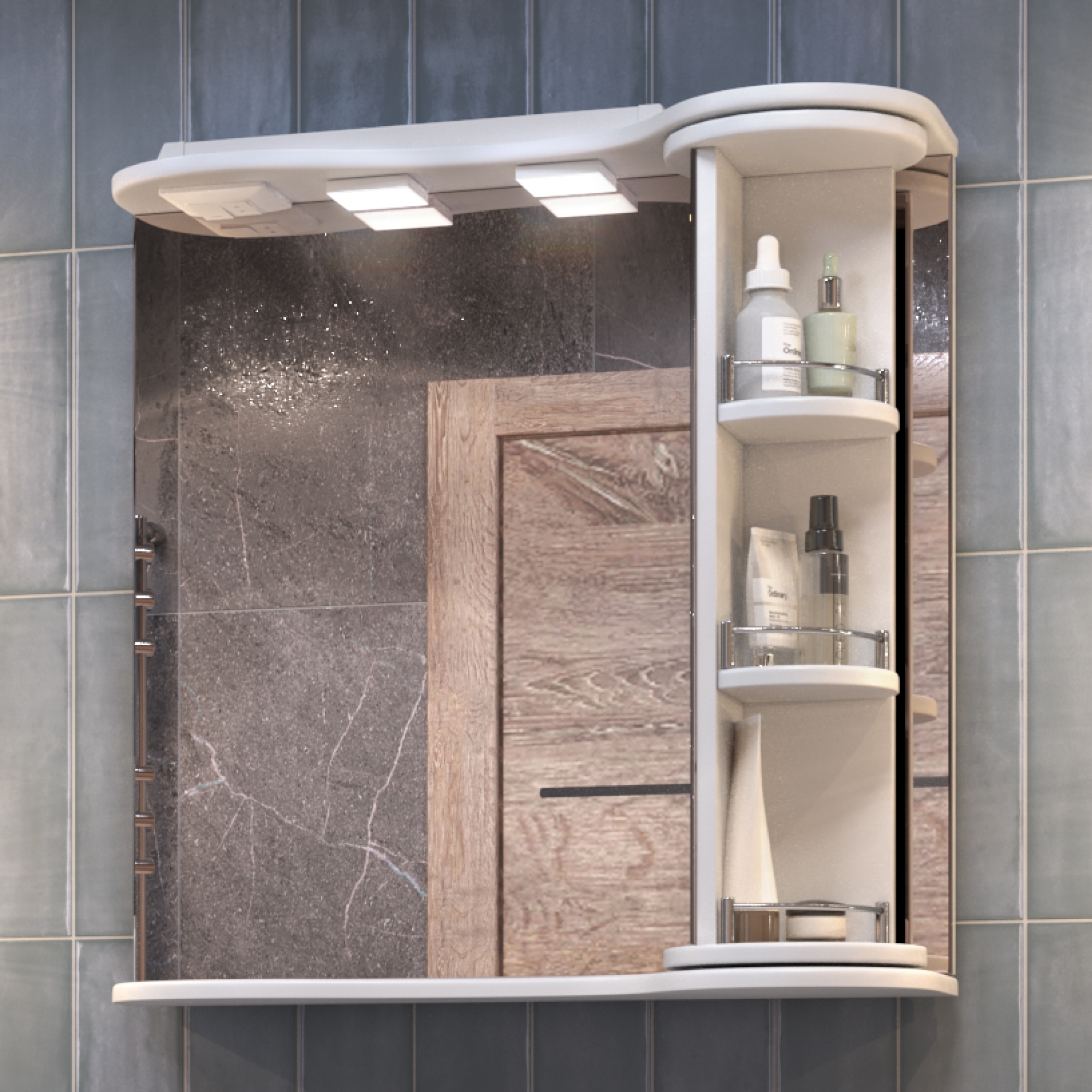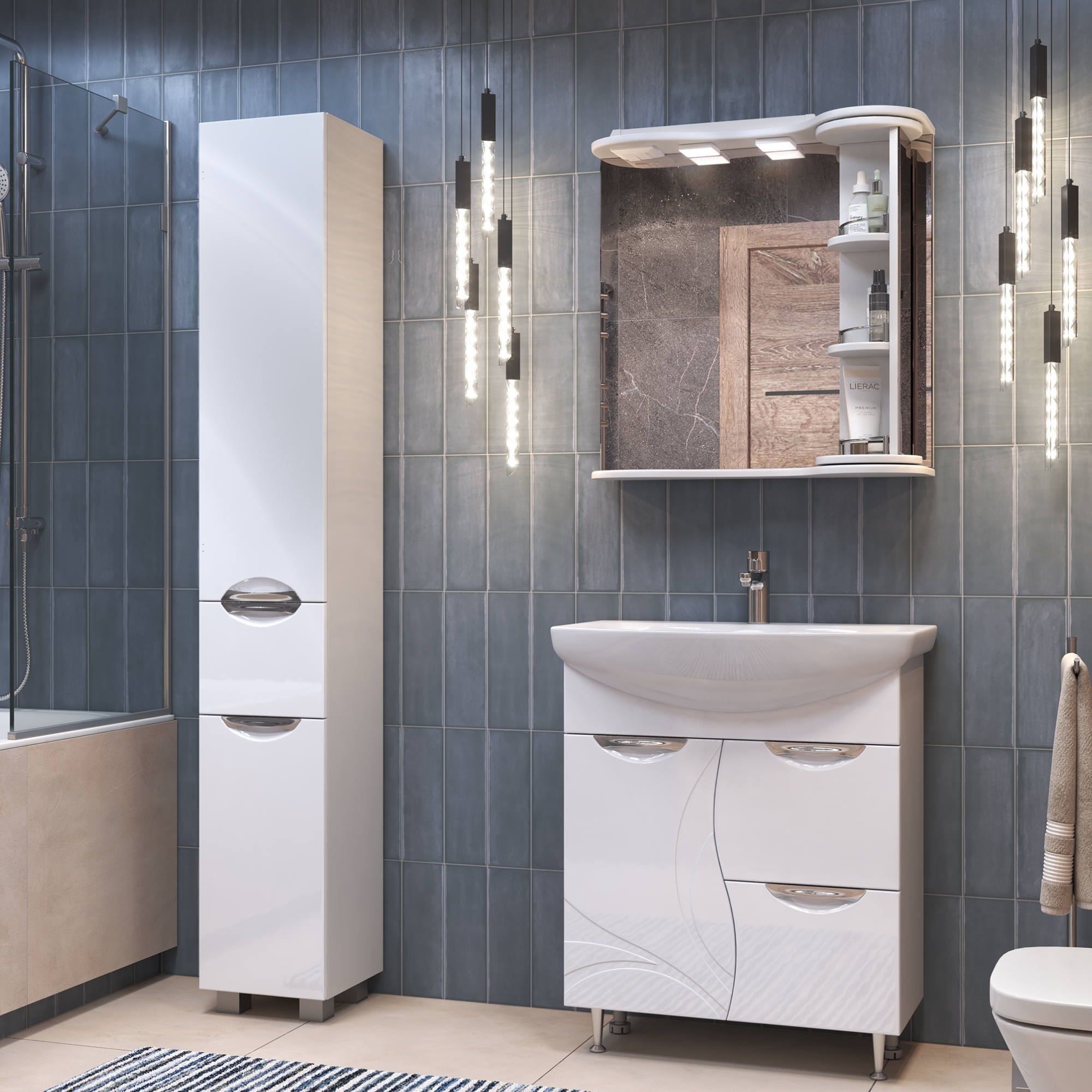 2 светодиодных светильника, включатель с розеткой.Специальный поворотный механизм колонны с полками, декоративный ограничитель на каждой полке.