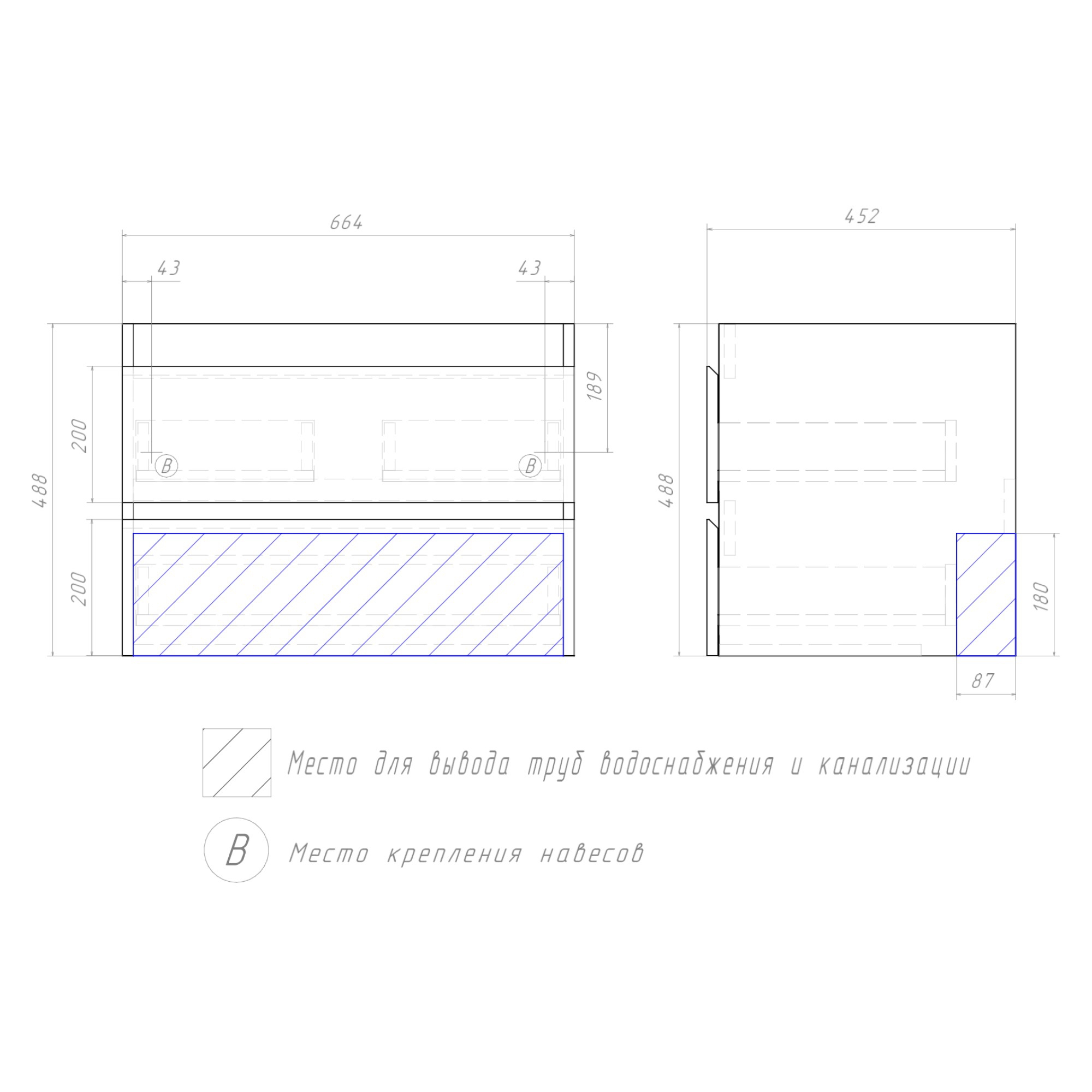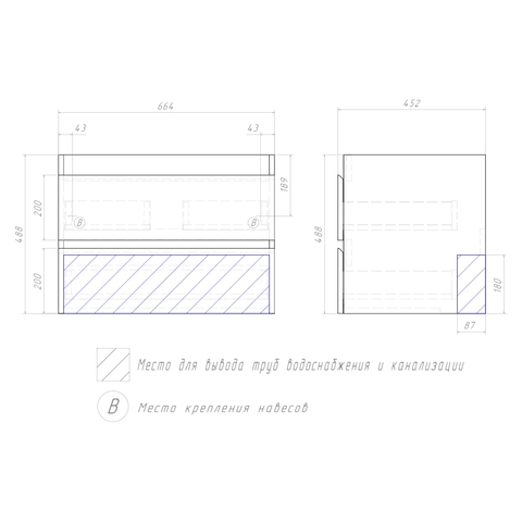 Оснащение:   2 выдвижных ящика, направляющие скрытого монтажа, 2 навеса. Поставка в разобранном виде