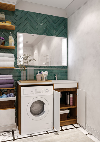 Особенностью модели является отделение под стиральную машину, что позволяет оптимально использовать пространство. Петли накладные с доводчиком делают использование мебели максимально комфортным, обеспечивая плавное закрытие дверок без лишних шумов.