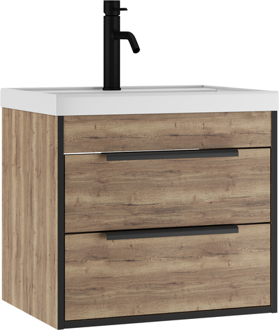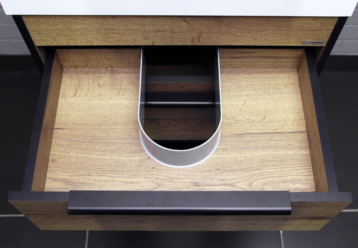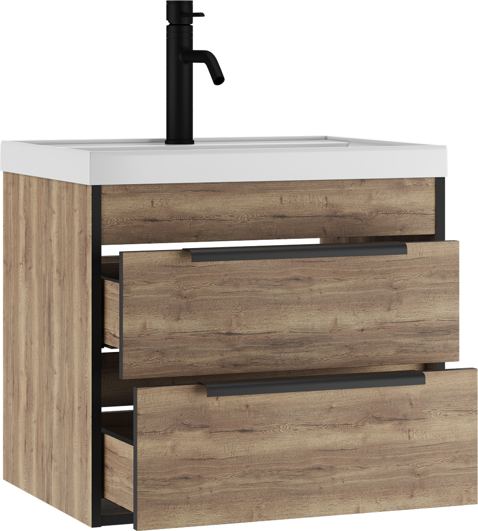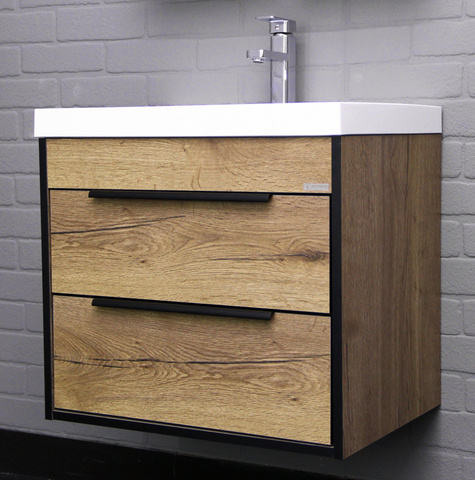 Подвесная модель не занимает место на полу, визуально увеличивая пространство ванной комнаты. Она представлена в интересном цвете Дуб Галифакс Табак, что делает ее привлекательной при выборе мебели в ванную.
