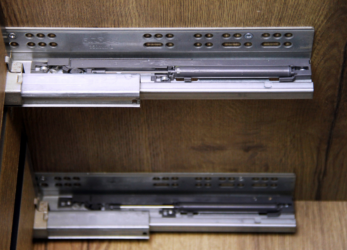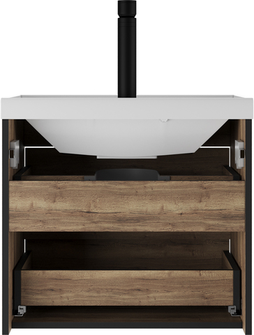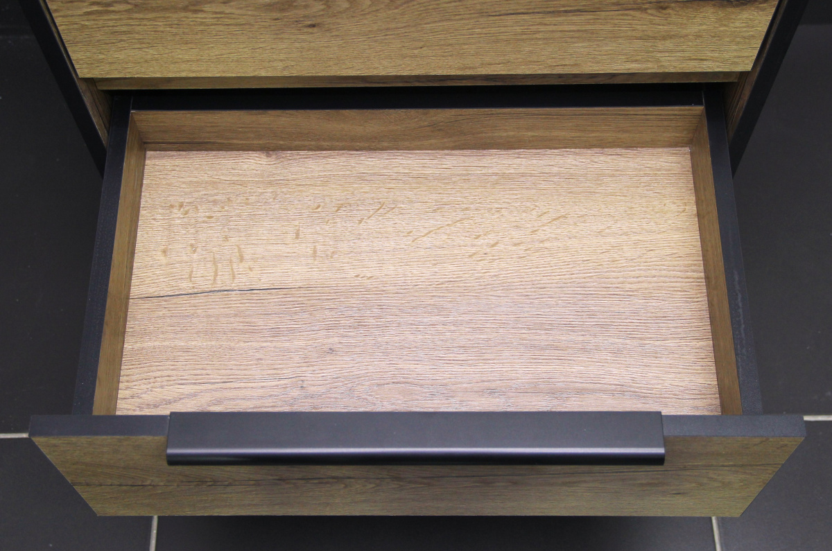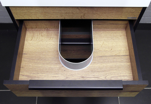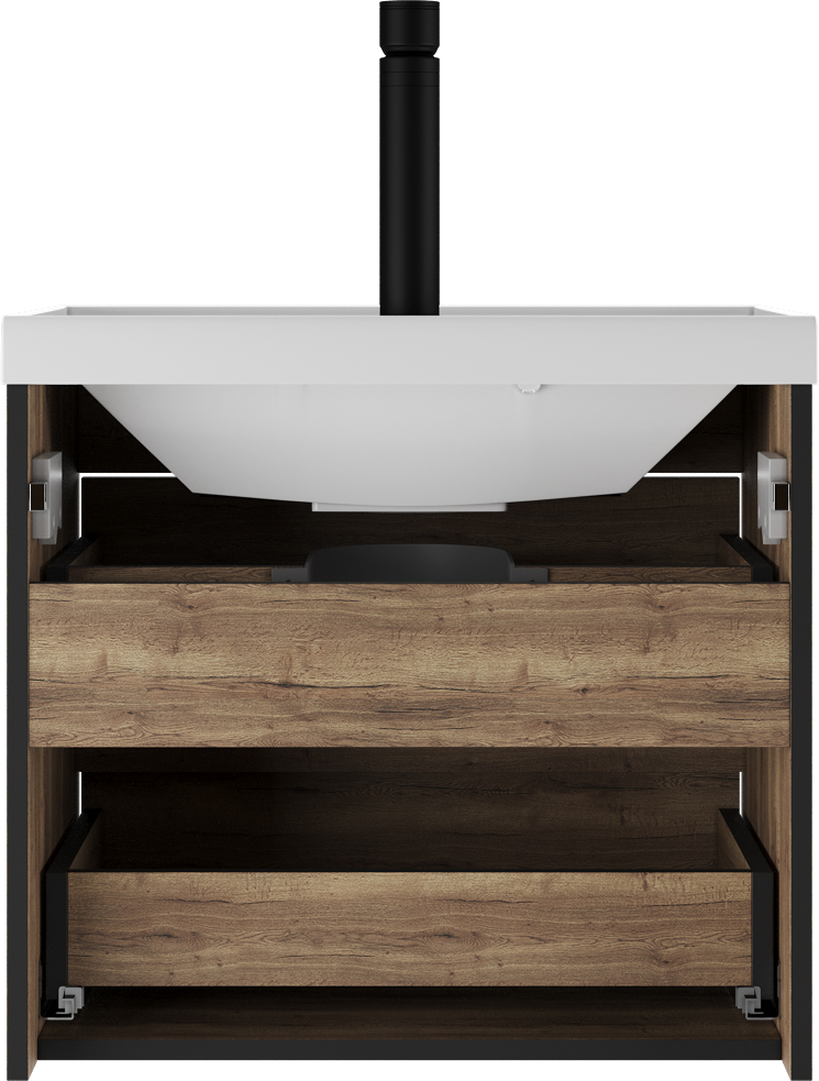 Направляющие скрытого типа с полным выдвижением и доводчиком делают процесс открытия ящиков легким и бесшумным. Ручка профильная черного цвета добавляет стильности. Эта тумба в ванную обладает удивительным сочетанием стиля и функциональности.